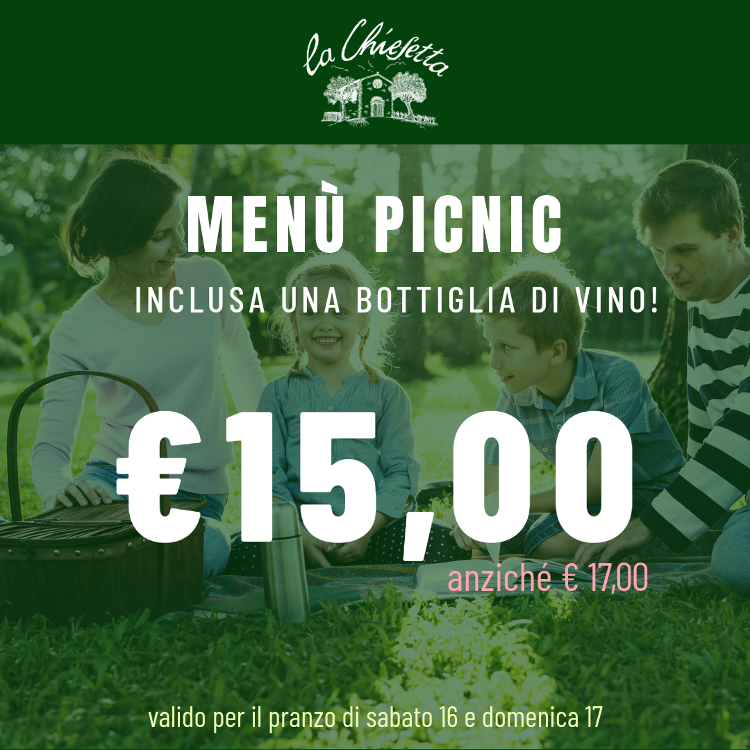Questa settimana arriva una mega promozione per gli escursionisti e amanti delle passeggiate sui colli : l’agriturismo La Chiesetta offre per il pranzo di sabato 16 e domenica 17 maggio un menù picnic da asporto che include affettati misti, focaccia, formaggi misti, sottaceti, torta di mele e un vino a vostra scelta che può essere un cabernet o un prosecco, il tutto di propria produzione a €15,00 anziché €17,00.
